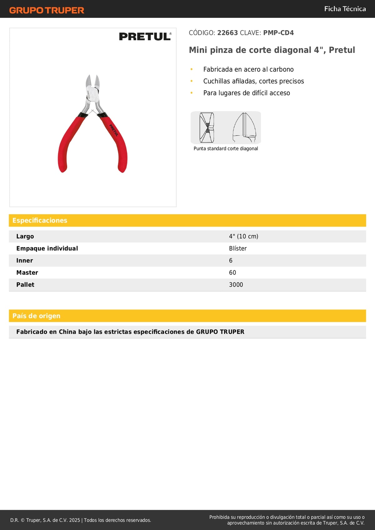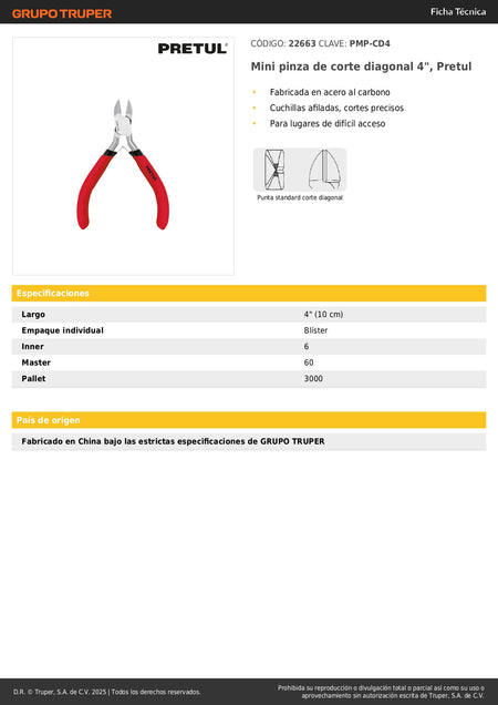 Mini Pinza de Corte Diagonal 4" PRETUL PMP-CD4 - Cortes Precisos en Espacios Reducidos