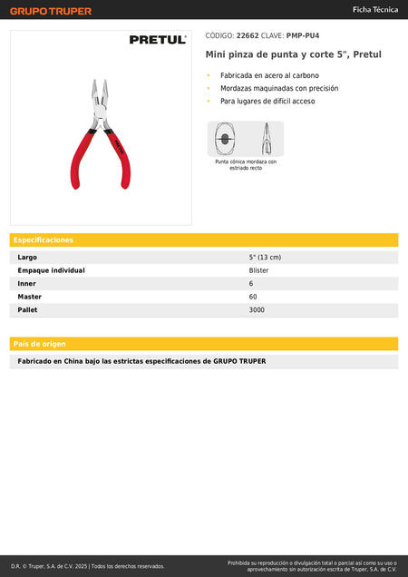 Mini Pinza de Punta y Corte 5" PMP-PU4 Pretul - Acero Carbono para Espacios Reducidos