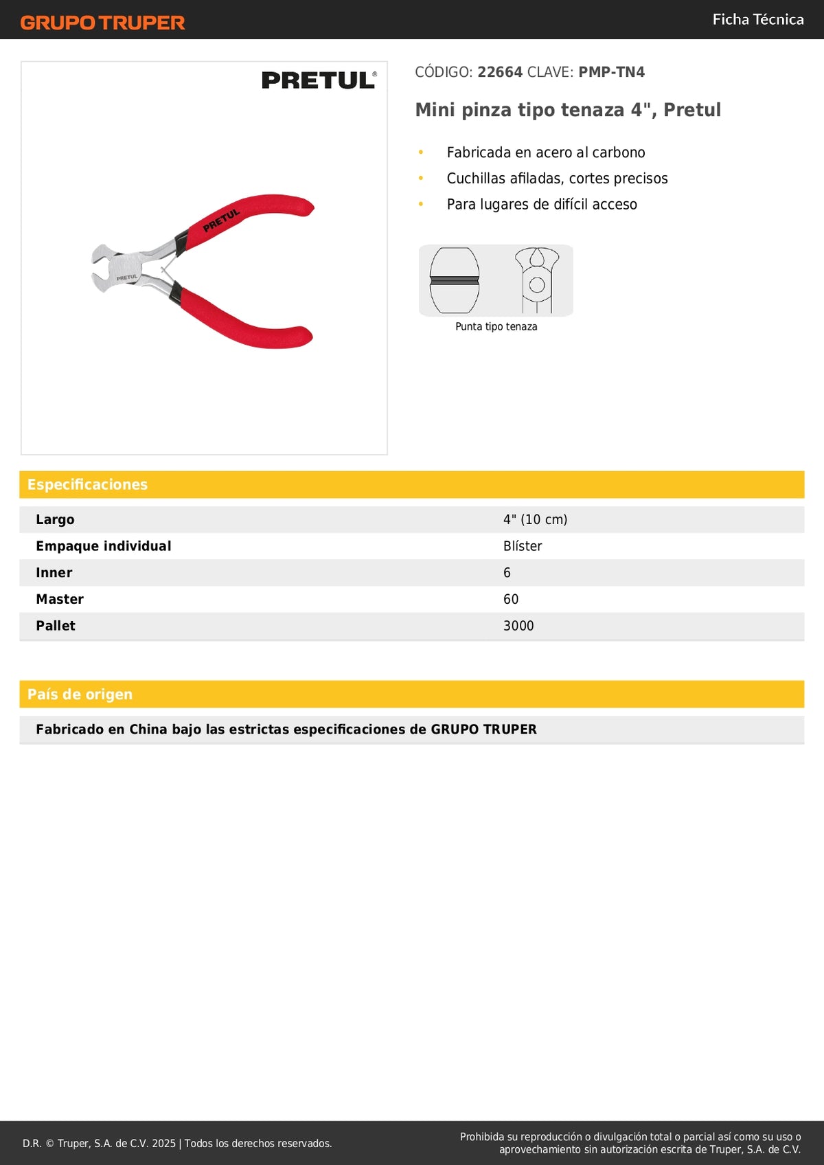 Mini Pinza Tenaza 4 Pulgadas Pretul PMP-TN4 - Acero Carbono para Espacios Reducidos y Cortes Precisos