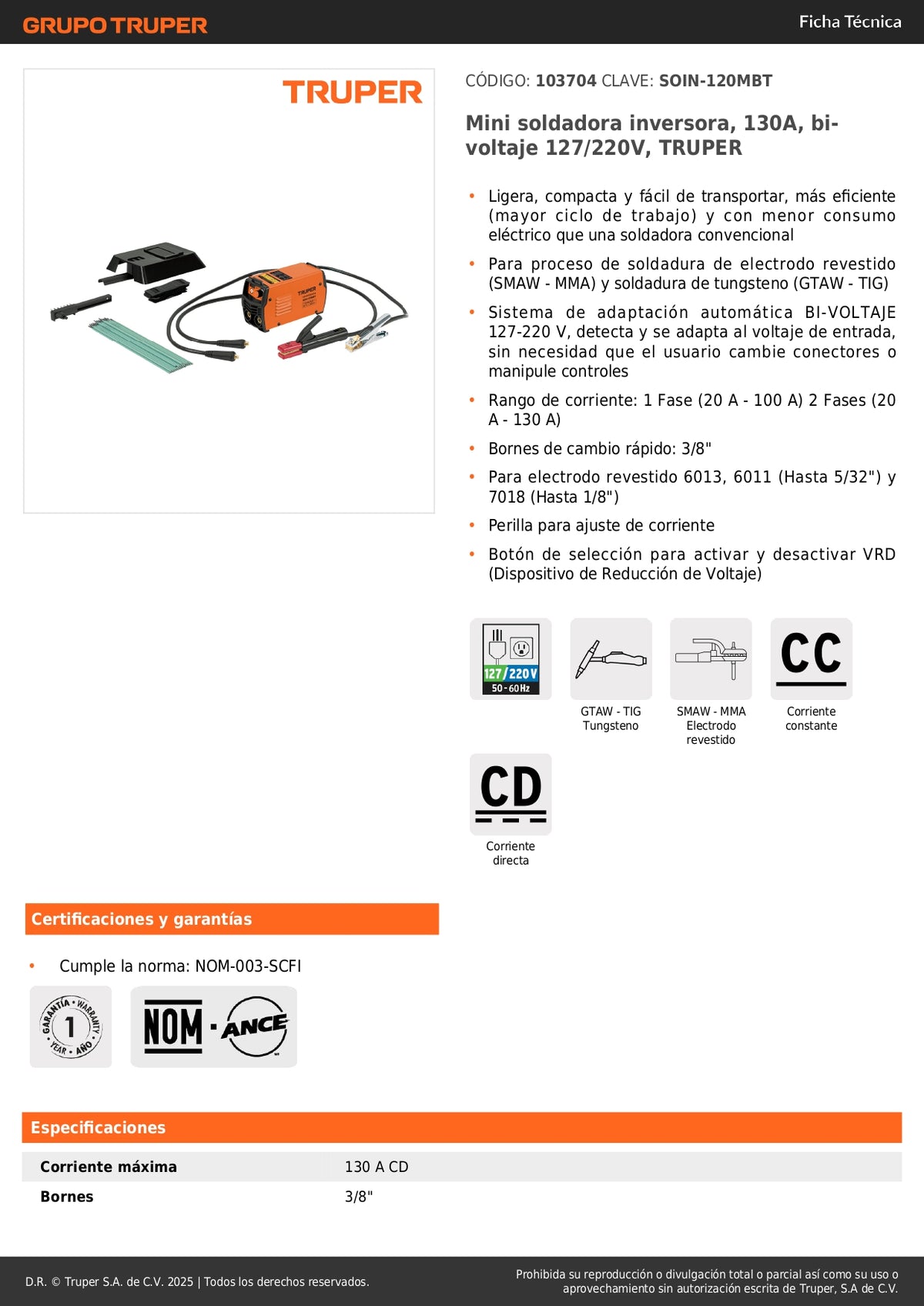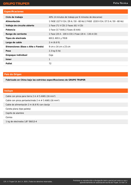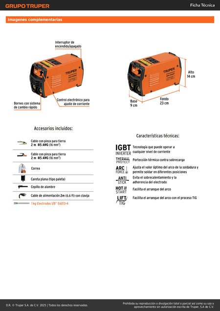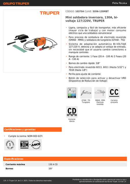 Mini Soldadora Inversora TRUPER 130A Bivoltaje 127/220V - Portátil y Eficiente para Soldadura Profesional SMAW TIG - SOIN-120MBT