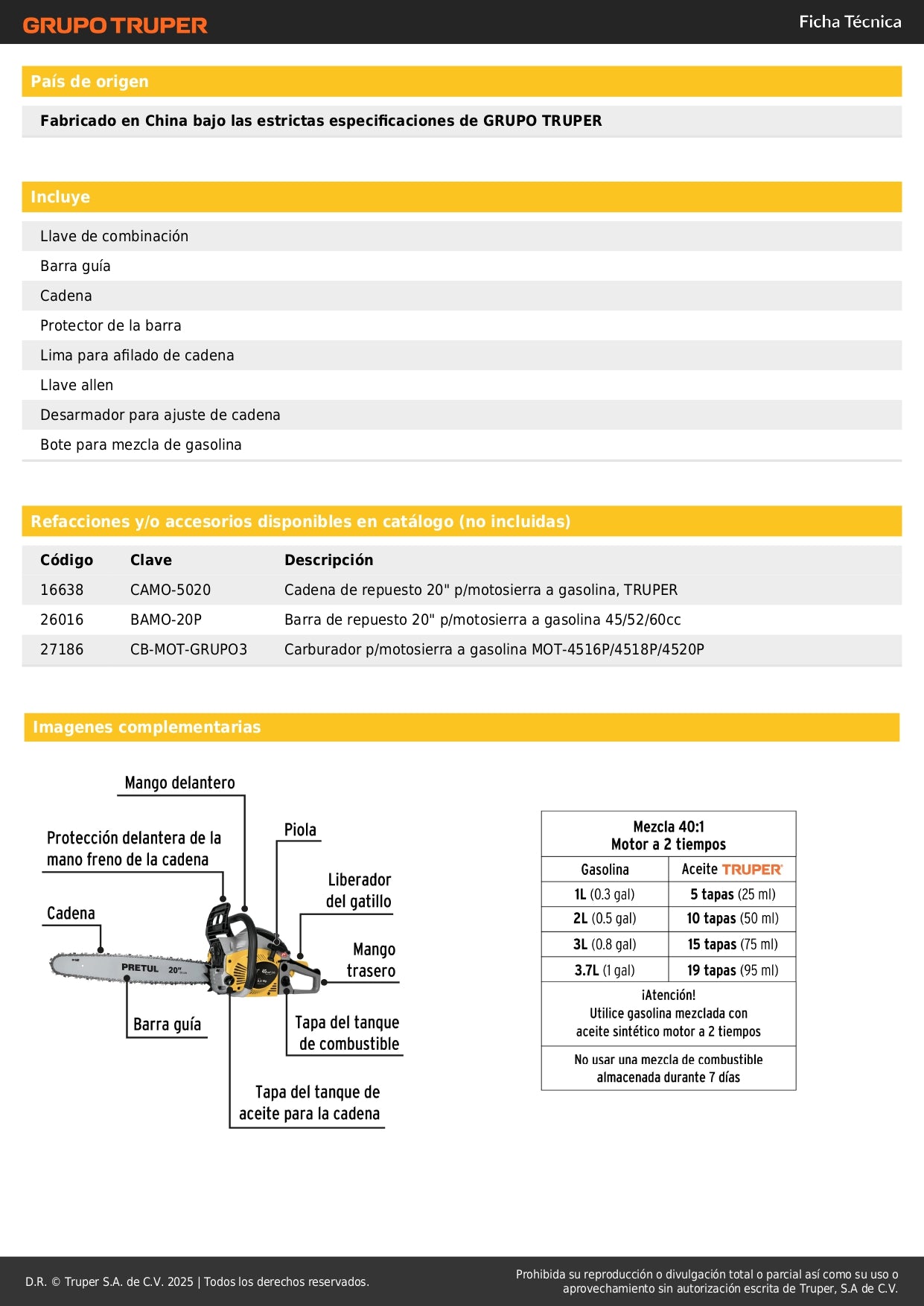 - Barra guía: 20 pulgadas (50cm) ideal para árboles grandes y trabajos forestales
