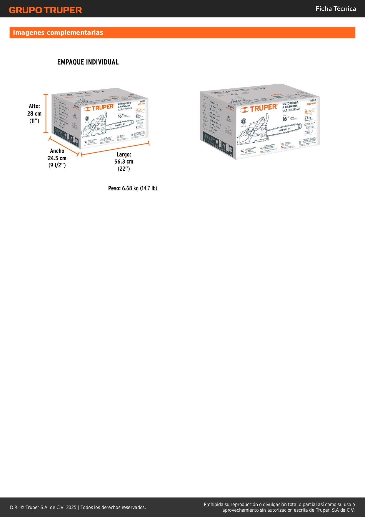 Cilindrada: 38cc | Potencia: 2.3HP (1.7kW) | Longitud de espada: 16" (40cm) | Motor: 2 tiempos gasolina | Sistema de seguridad: Safe-T-Tip antiretroceso | Marca: Truper - Calidad profesional garantizada