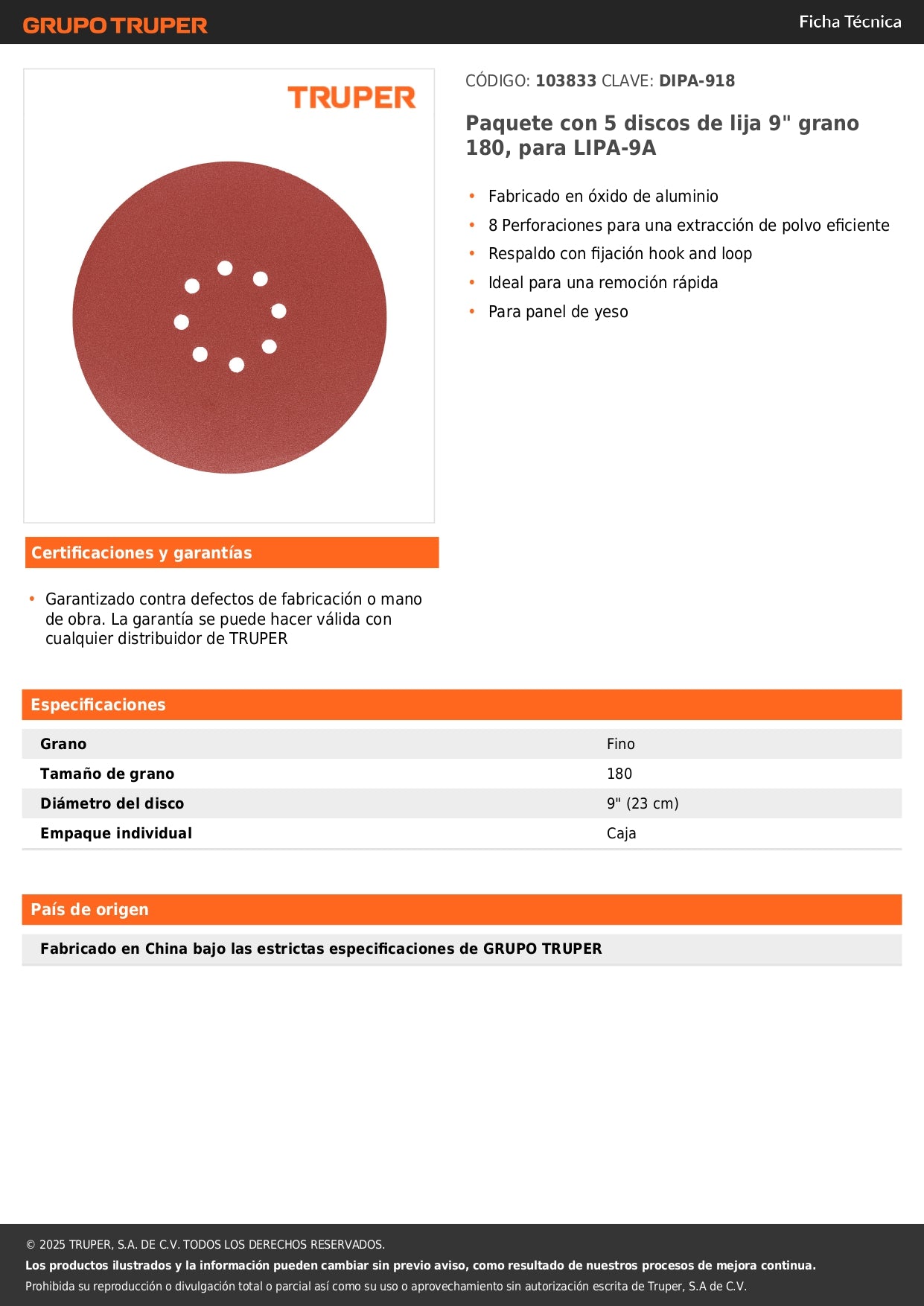- Compatibilidad: Diseñado para lijadora LIPA-9A TRUPER