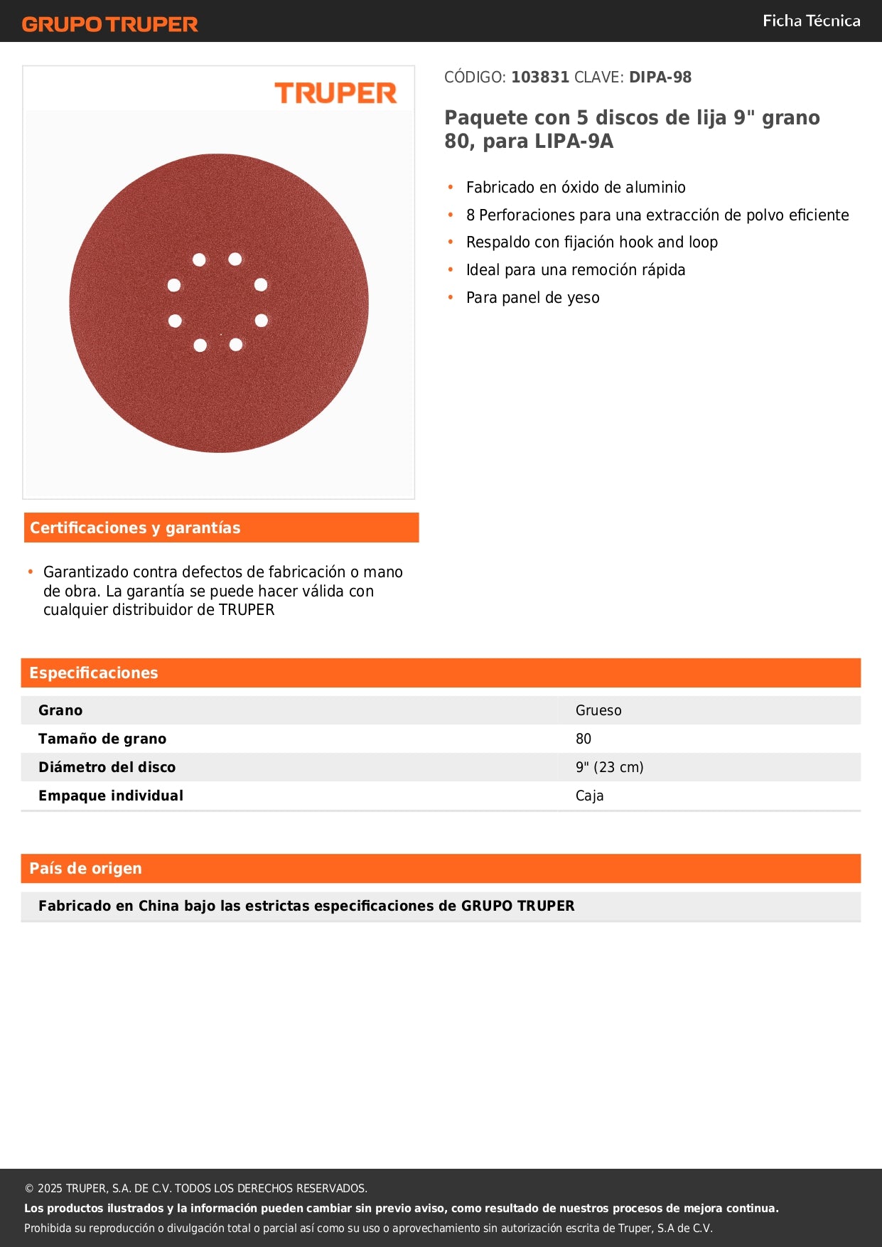- Compatibilidad: Diseñado para lijadora LIPA-9A y otras lijadoras orbitales de 9"