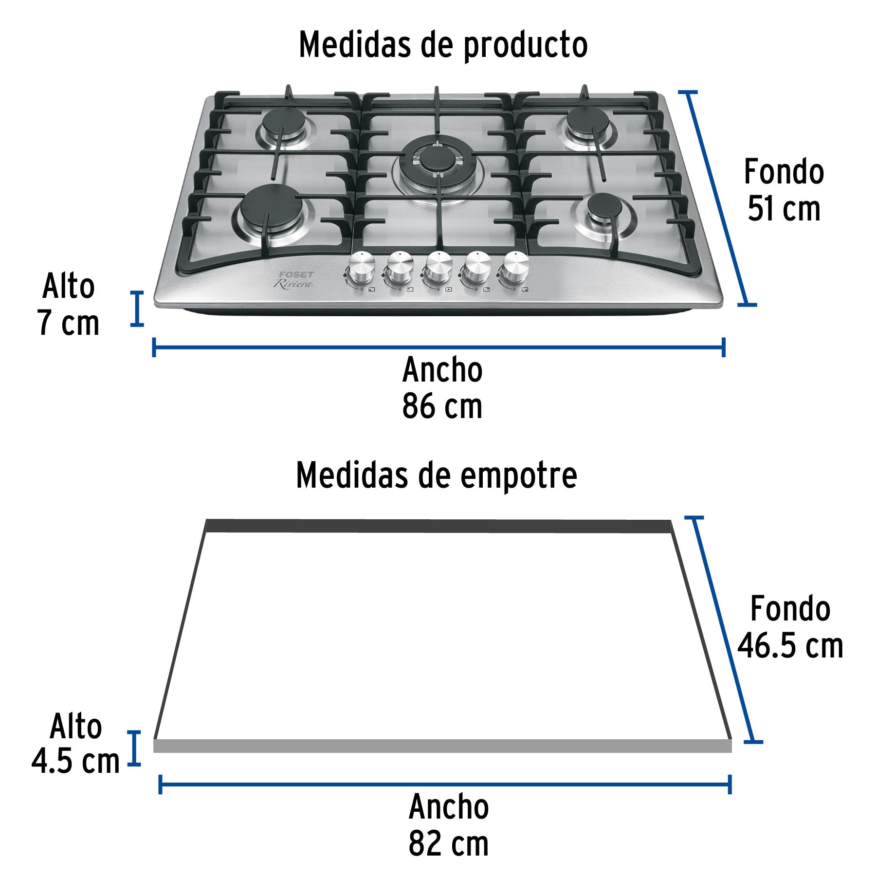 Parrilla Gas Empotrable 90cm 5 Quemadores Acero Inoxidable RIVIERA PAE-905GA - Encendido Electrónico