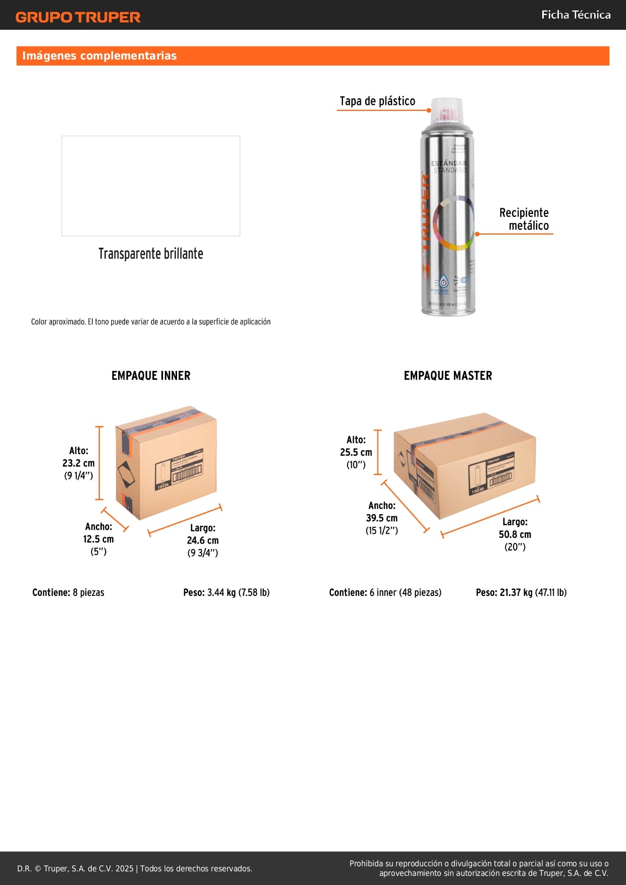 Esta laca transparente en aerosol proporciona una capa protectora invisible que realza el brillo natural de tus superficies sin alterar su color original. Su fórmula de secado rápido permite aplicar múltiples capas en poco tiempo, logrando un acabado profesional brillante resistente a la intemperie.