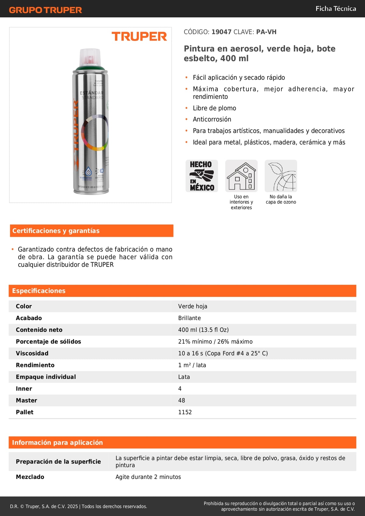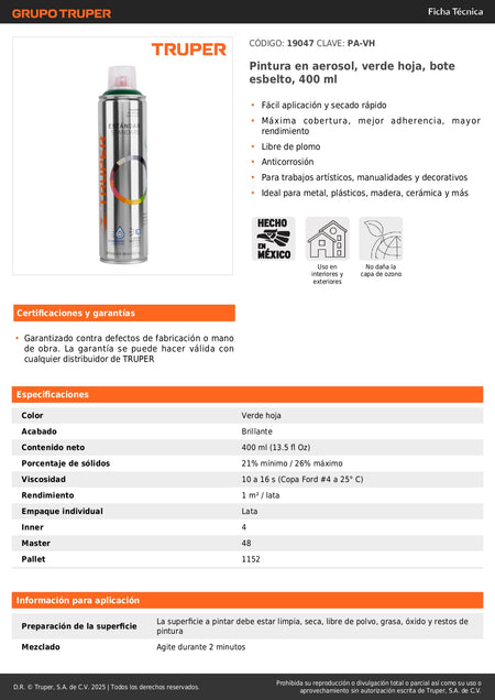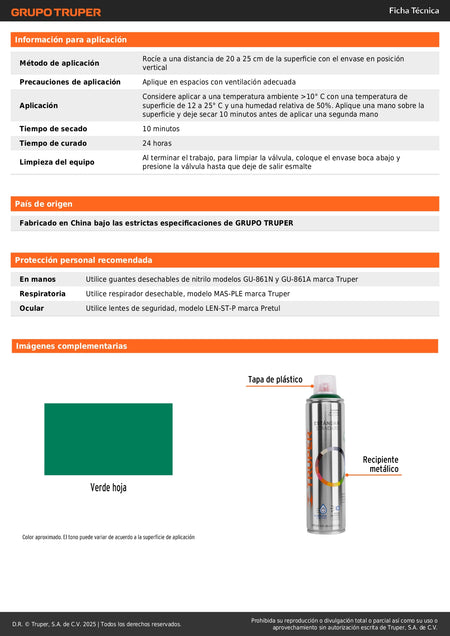 Pintura Aerosol Verde Hoja PA-VH 400ml - Anticorrosión Secado Rápido para Metal Madera Plástico