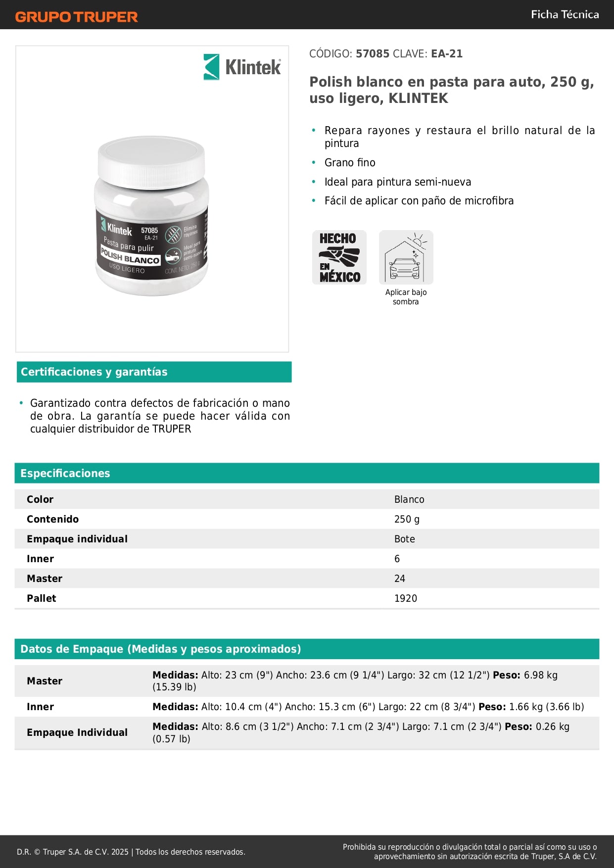 Elimina rayones superficiales y opacidad de la pintura de tu vehículo con esta pasta pulidora profesional de grano fino. Ideal para pintura semi-nueva y acabados delicados.