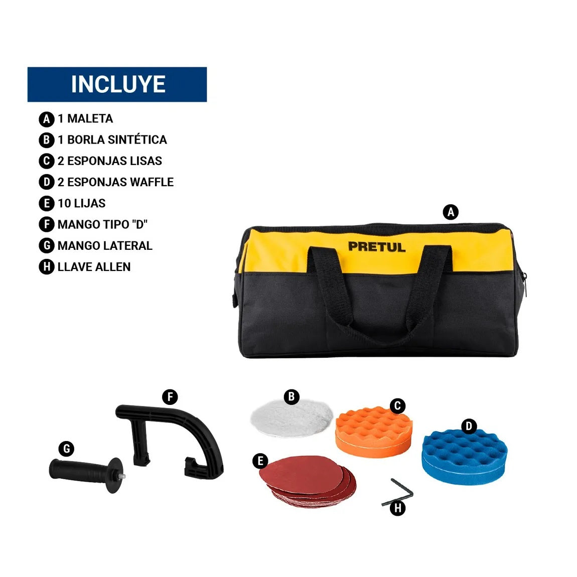 Pulidora Rotativa PRETUL 7 Pulgadas 1200W Profesional - Elimina Rayones y Restaura Brillo en Autos, Metales y Plásticos - Motor Potente con Velocidad Variable - PULA-7P