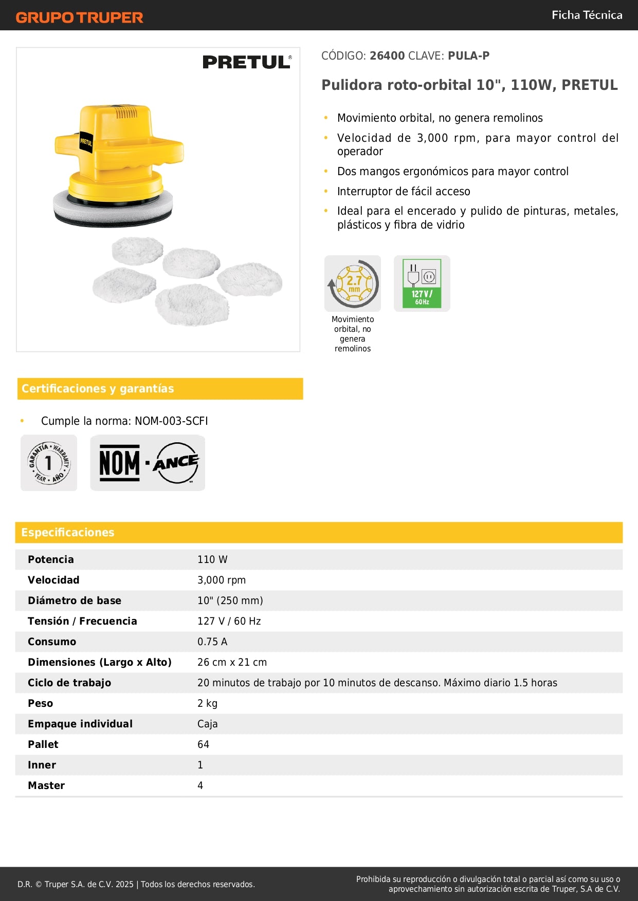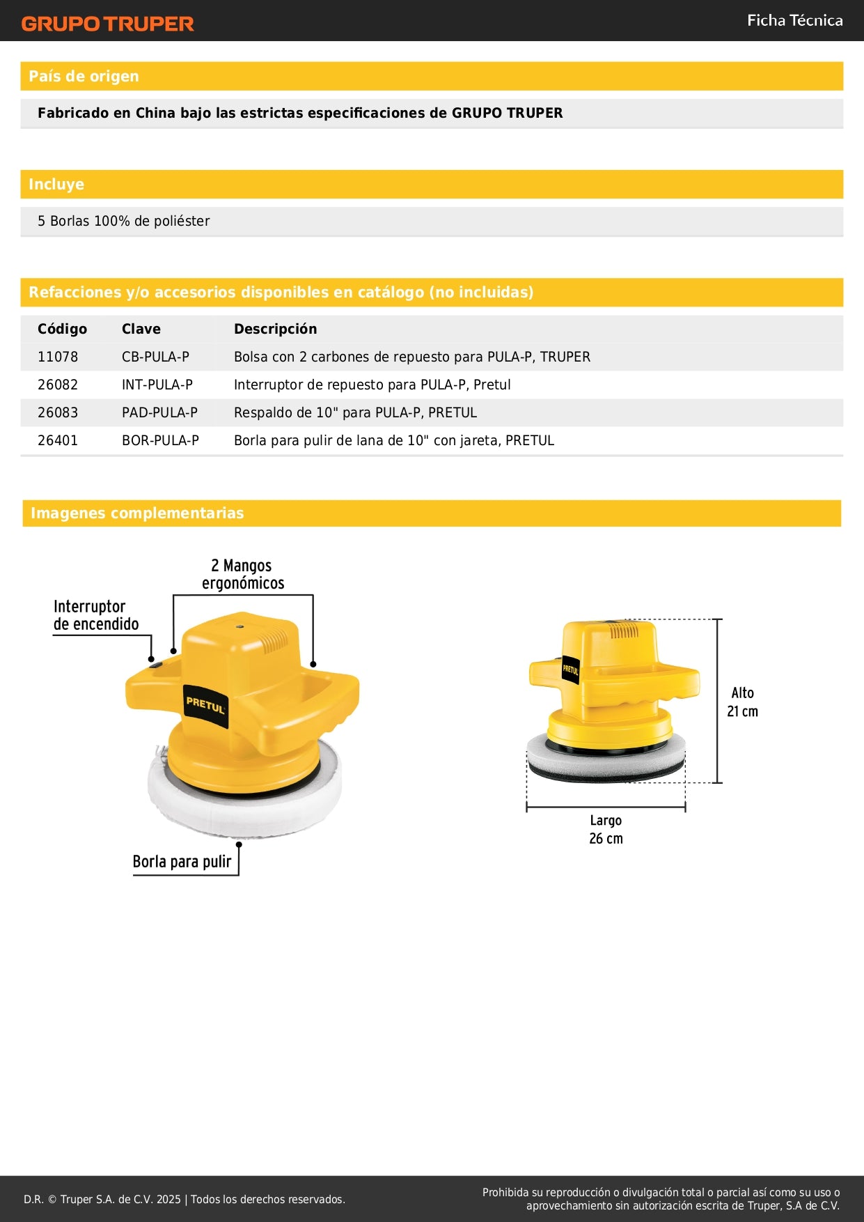 Pulidora Roto-Orbital PRETUL 10 Pulgadas - Acabado Profesional para Automotriz