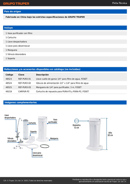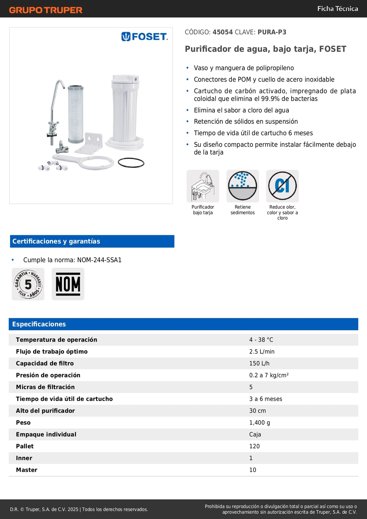 Purificador de Agua Bajo Tarja FOSET PURA-P3 - Elimina 99.9% Bacterias y Cloro - Carbón Activado con Plata Coloidal