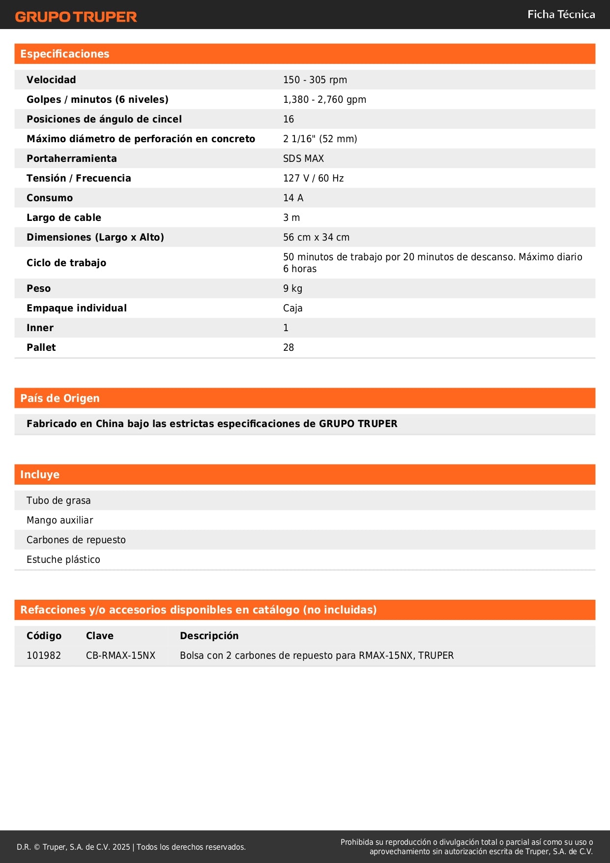 - Energía de impacto: 15 joules para perforación en materiales duros