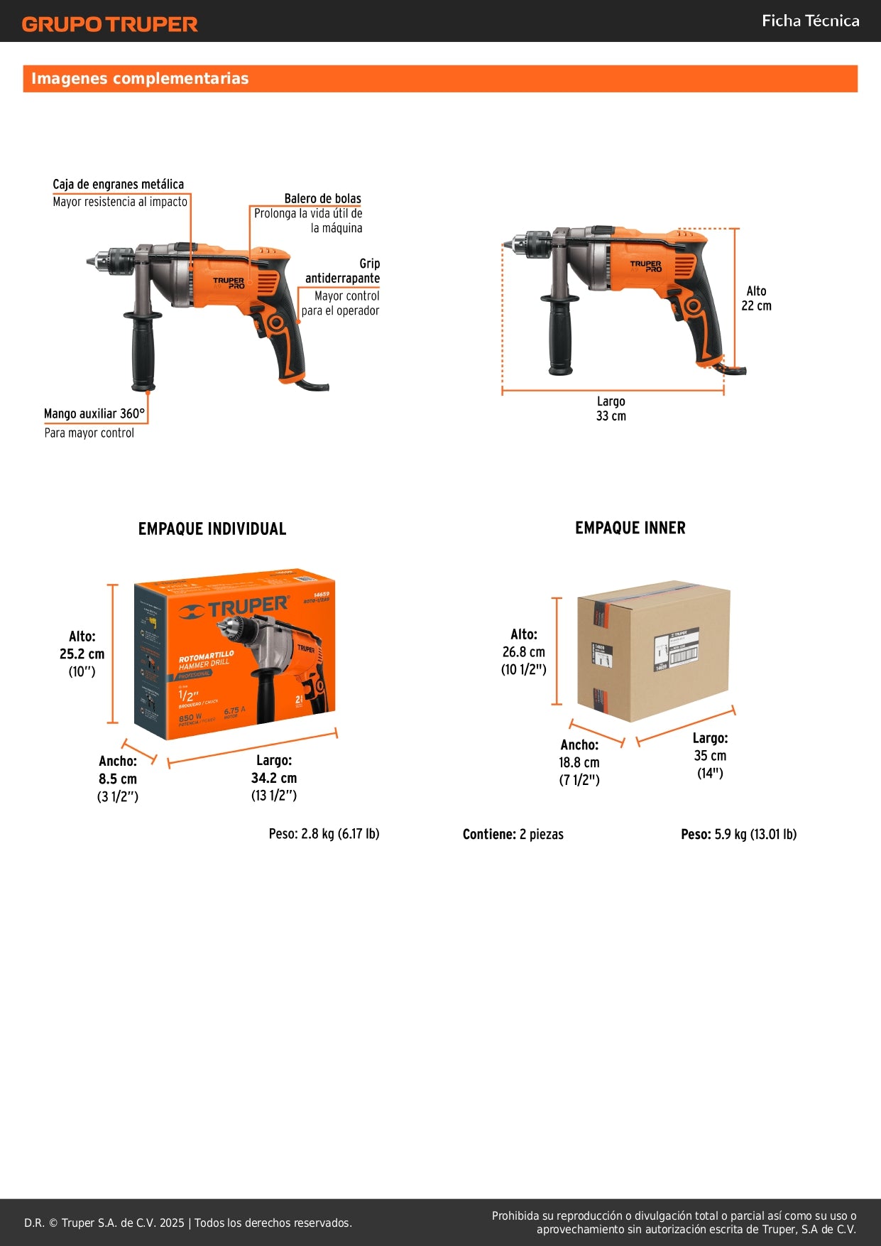 Especificaciones técnicas: Motor 850W, Portabrocas 1/2", Selector de función, Mango ergonómico. SKU: 14659