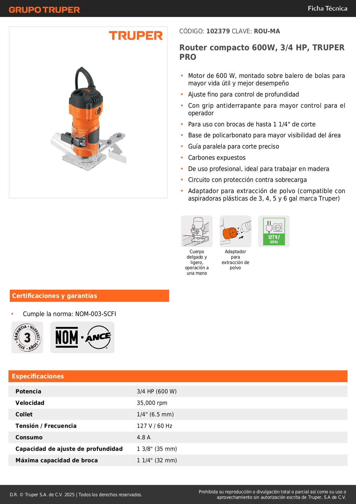 El router eléctrico TRUPER ROU-MA de 600W (3/4 HP) es la herramienta ideal para carpinteros profesionales y aficionados que buscan cortes precisos y acabados perfectos en madera. Su diseño compacto y potente motor garantizan resultados profesionales en cada proyecto.