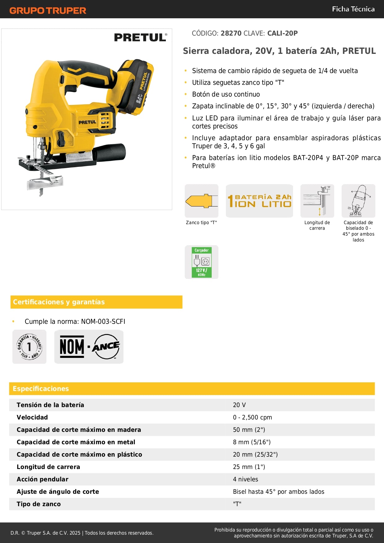 La Sierra Caladora Inalámbrica PRETUL 20V es la herramienta perfecta para cortes precisos en madera, metal y plástico. Con su batería de litio 2Ah incluida y guía láser integrada, obtendrás resultados profesionales en cada proyecto.