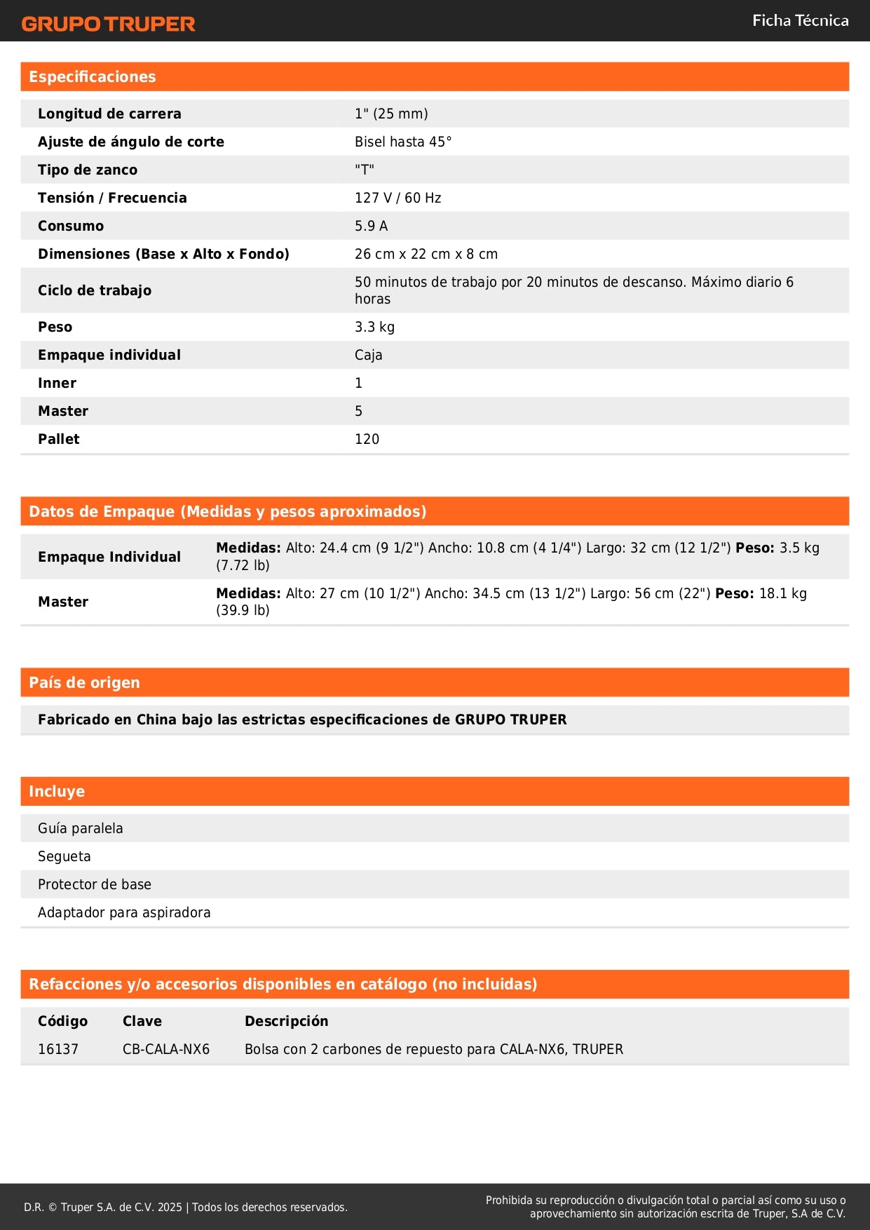 La Sierra Caladora TRUPER INDUSTRIAL CALA-NX6 es la herramienta eléctrica profesional ideal para realizar cortes precisos y curvos en madera, metal, plástico y otros materiales. Con su potente motor de 750W con baleros de bolas, garantiza durabilidad y rendimiento superior en trabajos exigentes.