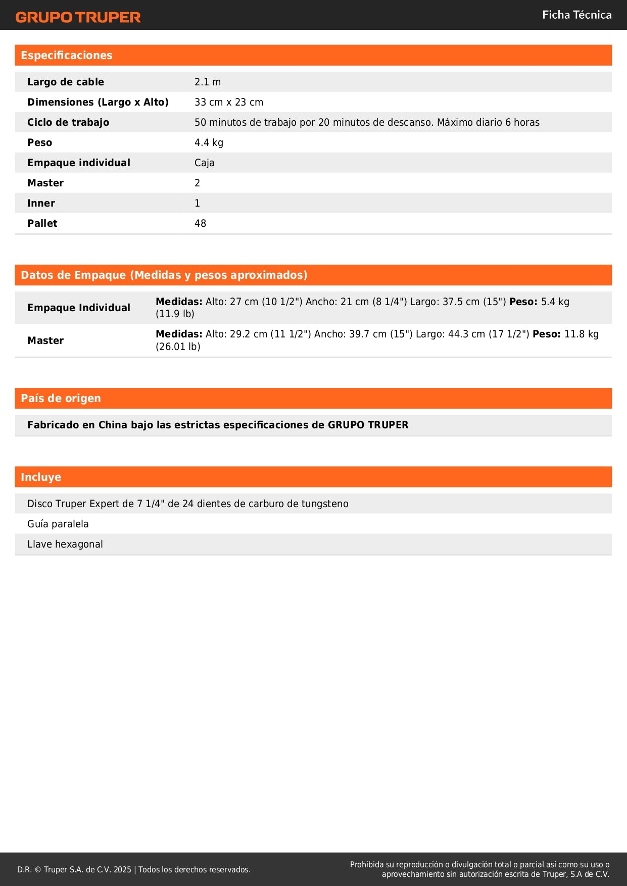 Incluye: Sierra circular, disco de corte, guía paralela, llave hexagonal y manual de usuario.