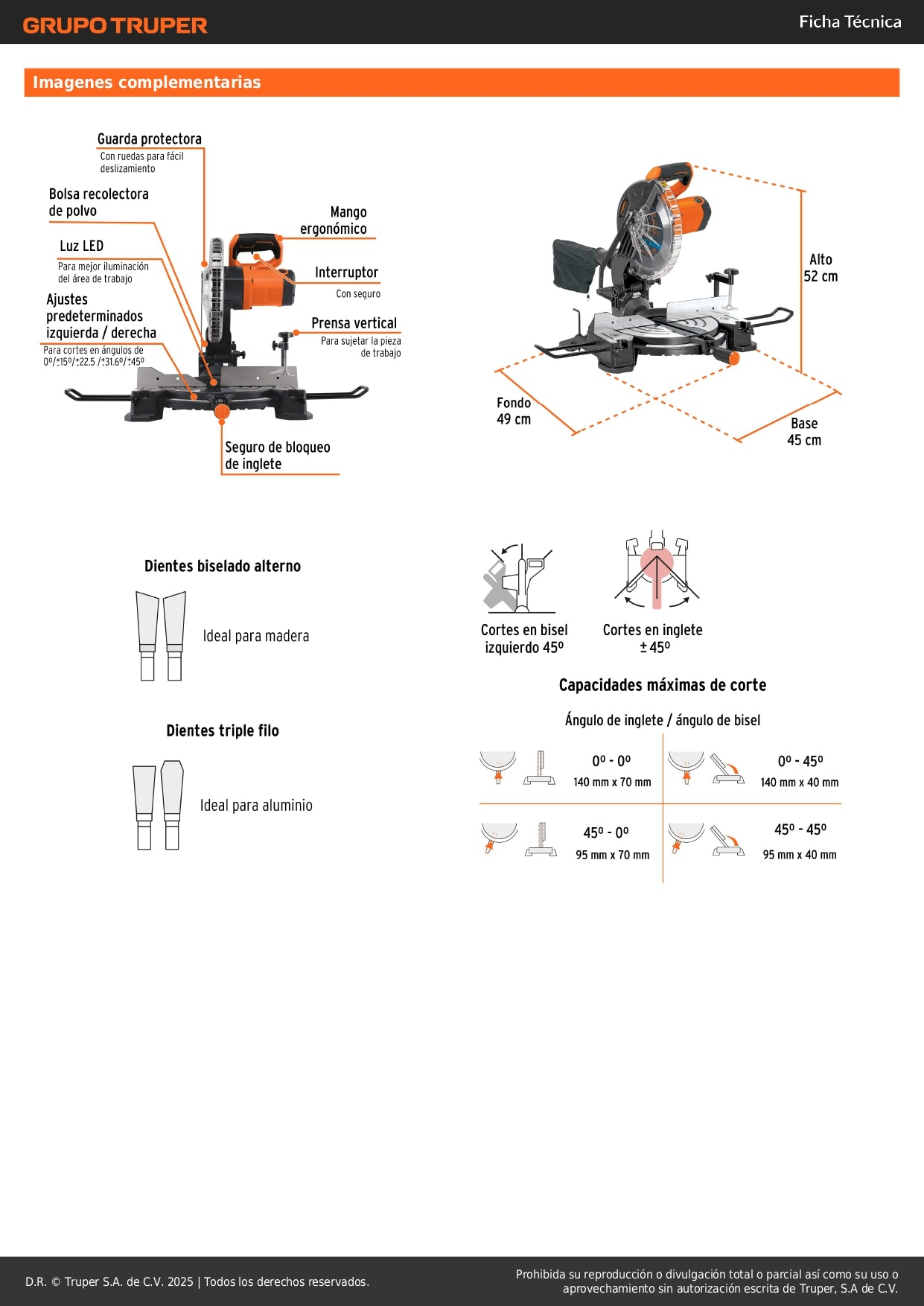 Perfecta para molduras, marcos, zoclos, pisos laminados, trabajos de carpintería y proyectos de construcción que requieren cortes angulares precisos. Ideal para talleres profesionales y uso en obra.