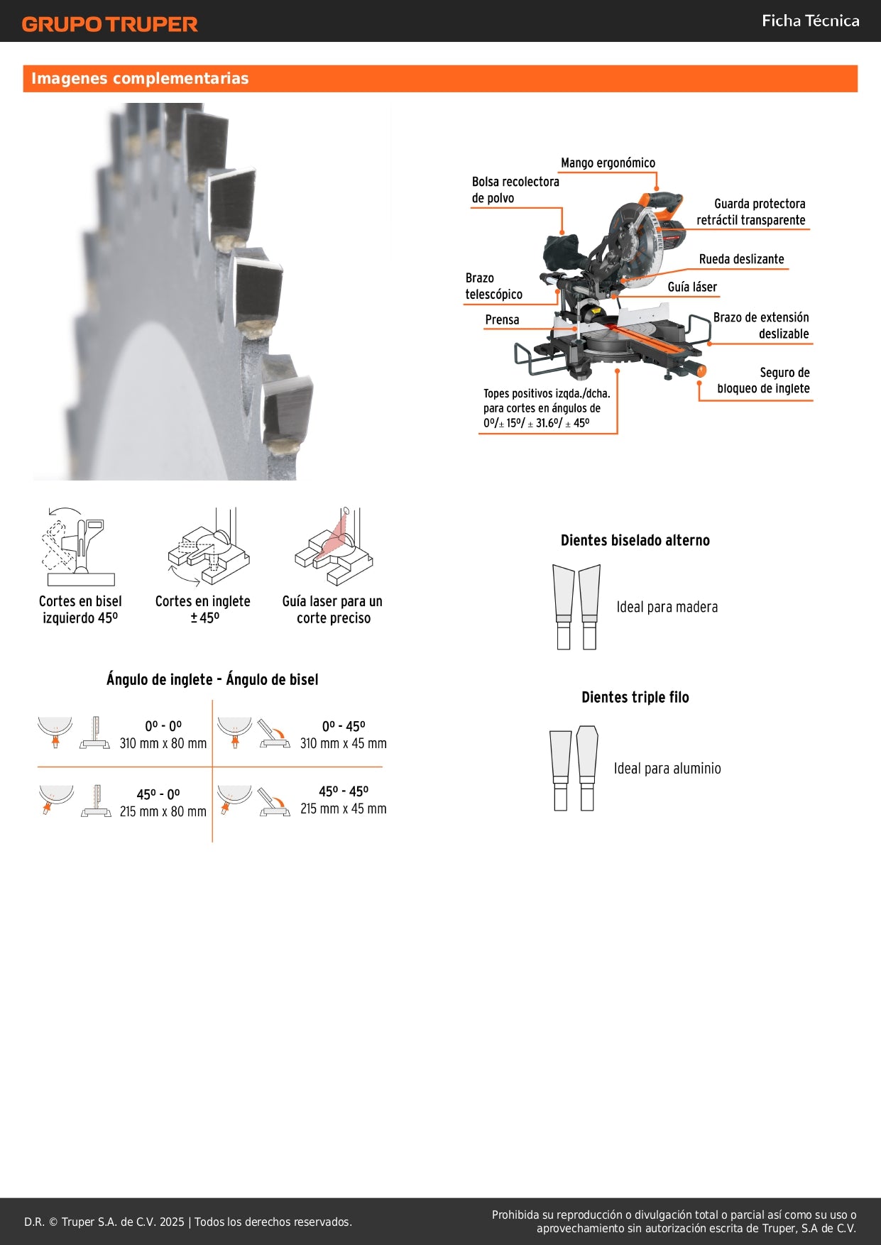 Perfecta para cortar madera, aluminio, PVC y materiales compuestos. Ideal para marcos, molduras, zoclos, pisos laminados, trabajos de carpintería y construcción profesional.
