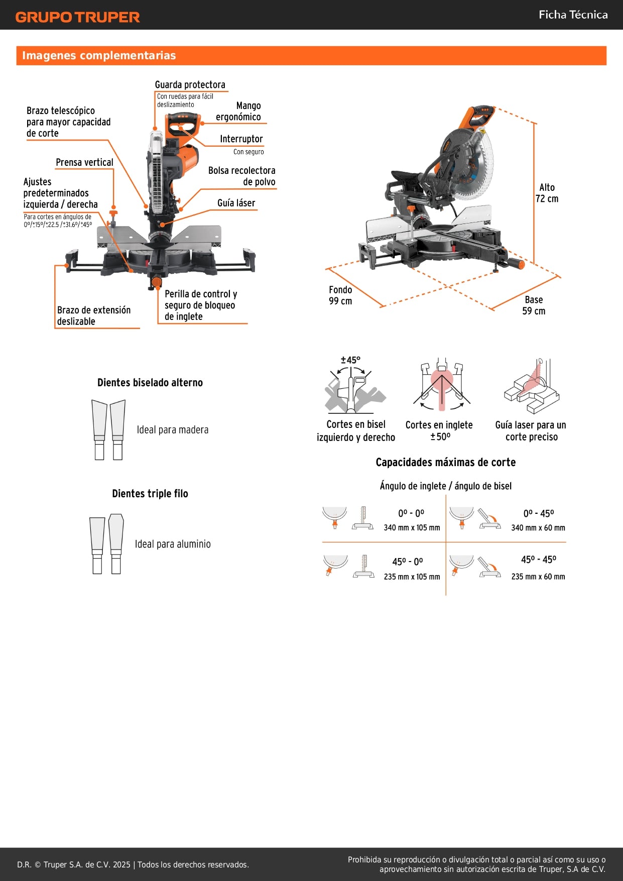 - Cortes en bisel hasta 45° - Versatilidad para cortes angulares precisos