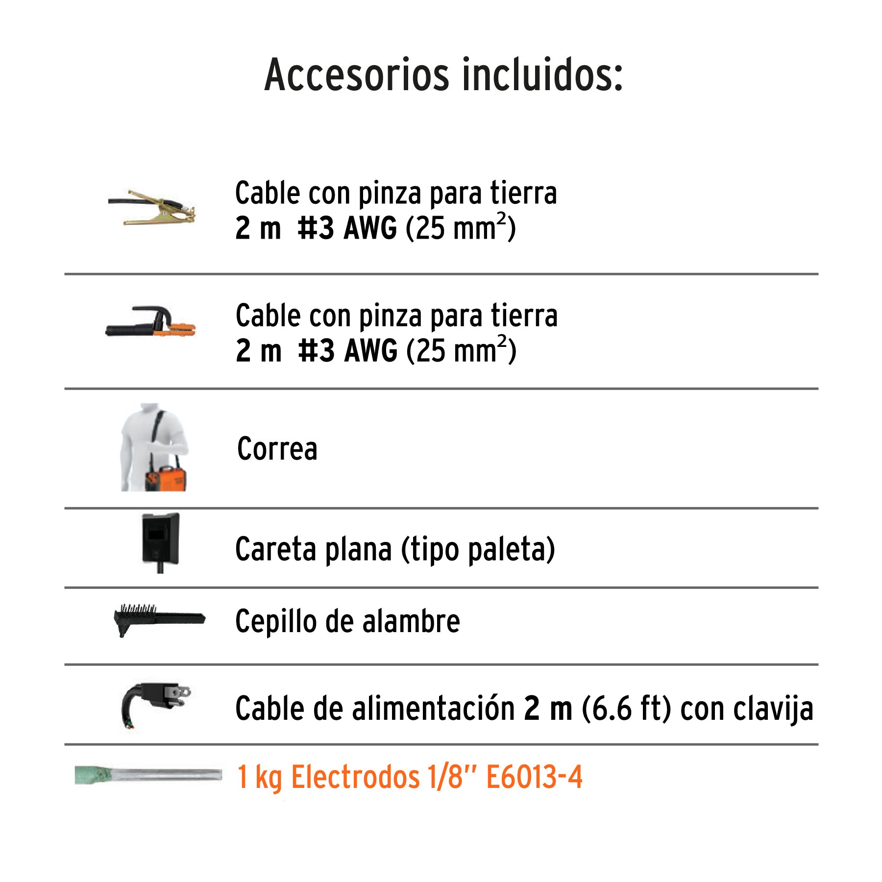 Incluye soldadora inversora, cable de tierra, portaelectrodo, manual de usuario y accesorios necesarios para comenzar a trabajar de inmediato.