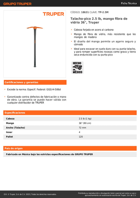 Talacho-Pico 2.5 lb Truper TP-2.5M - Herramienta Excavación Suelo Duro y Demolición Rocas - Mango Fibra Vidrio 36 Pulgadas