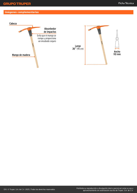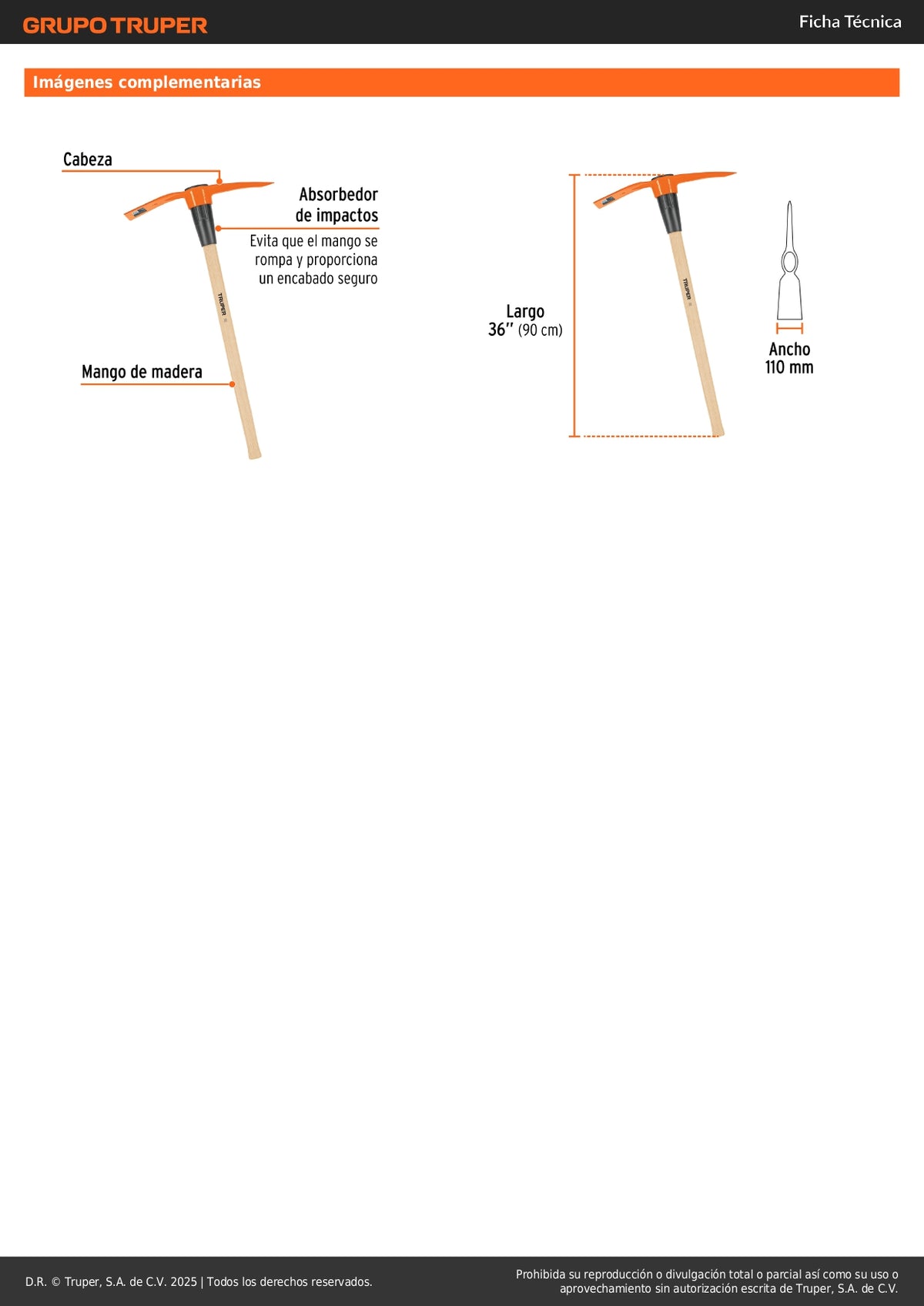 Talacho-Pico Truper 5 lb Mango Madera 36" - Herramienta Excavación Suelo Duro y Demolición Rocas TP-5MM