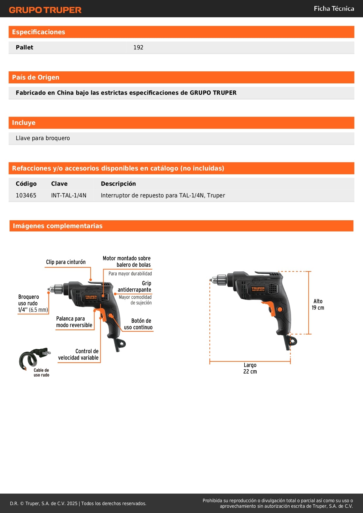 El taladro eléctrico TRUPER INDUSTRIAL de 1/4 pulgada es la herramienta perfecta para trabajos de perforación profesional y uso intensivo. Con su motor de 380 watts, este taladro industrial ofrece el rendimiento y la durabilidad que necesitas en tu taller o obra.