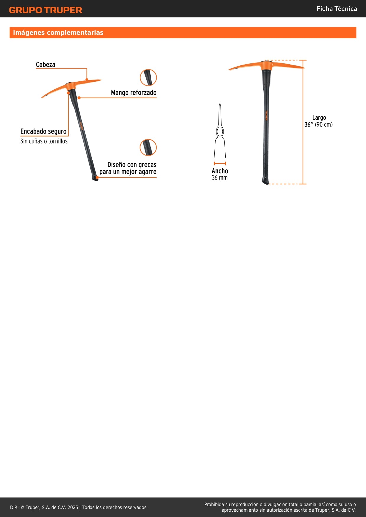 - Doble función: Pico para romper tierra dura y pala para excavar